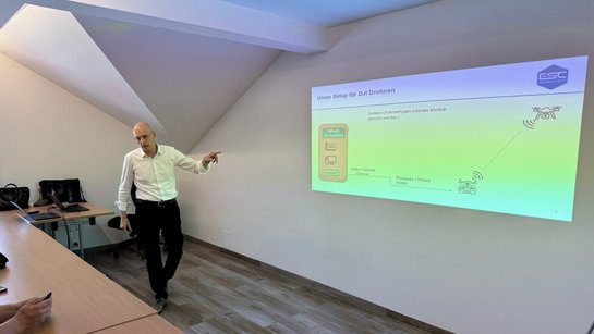 Die Infoveranstaltung fand am Beginn im Lehrsaal statt und danach gab eine Praxisdemo im Freien. Bei glühender Hitze wurden im Lehrsaal ein paar technische, inhaltliche und kommerzielle Punkte durch den Geschäftsführer der Firma Esc-Aerospace präsentiert und mit den Erfahrungen des Tiroler Drohnenpiloten Alexander Vergeiner abgerundet. Im Anschluss an den Theorieteil wurde im Freien gezeigt, wie die künstliche Intelligenz die Personensuche unterstützt.